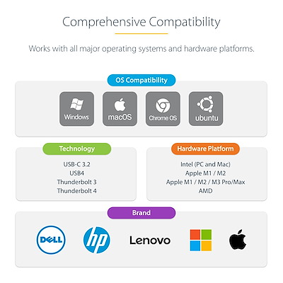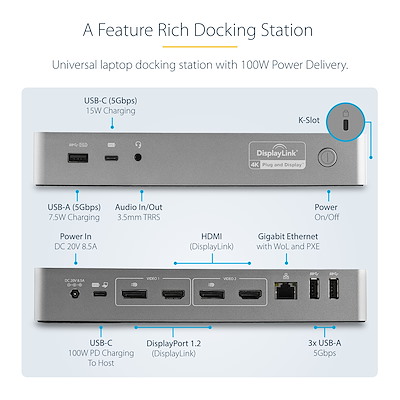 This docking station is fully certified to meet top industry standards for USB-IF (USB 3.1 Gen 1, USB Type-C and Power Delivery), VESA DisplayPort and DisplayLink (video connections) certification to guarantee the highest quality, reliability, and compatibility.
